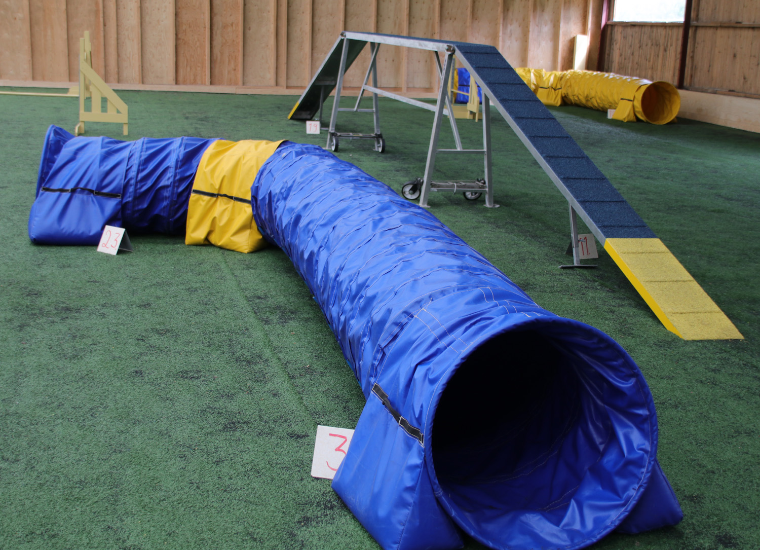 Keinonurmipohjainen ( kumirouhe) halli kooltaan n. 15 x 35m. Hallista löytyy AGIMET agilitykalusto perusesteineen + kaksi putkea ja pöytä. Hallissa myös liikuteltavat, matalat seinäelementit, joilla saat aidattua tilaa tarpeesi mukaan.